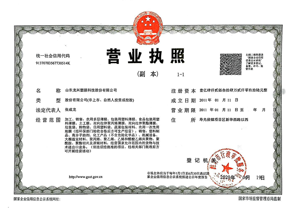 山東龍興塑膜科技股份有限公司前身為山東壽光龍興農(nóng)膜有限公司組建于2011年,2018年10月重組,目前是壽光市國有控股公司、高新技術(shù)企業(yè),是專業(yè)生產(chǎn)高檔農(nóng)用薄膜、工業(yè)用薄膜的企業(yè),是一家以產(chǎn)品制造為主,集科研開發(fā)、產(chǎn)品設計、技術(shù)服務于一體的綜合性企業(yè)。公司現(xiàn)有職工228人,各類工程技術(shù)人員97人,管理人員20余人,注冊資金14234.2096萬元,總資產(chǎn)102314萬元,目前是壽光市國有控股公司、高新技術(shù)企業(yè)。公司是中國塑料加工工業(yè)協(xié)會農(nóng)膜專業(yè)委員會會員單位,中國復合材料工業(yè)協(xié)會會員單位,中國塑料加工工業(yè)協(xié)會雙向拉伸聚酯薄膜專業(yè)委員會會員單位...
